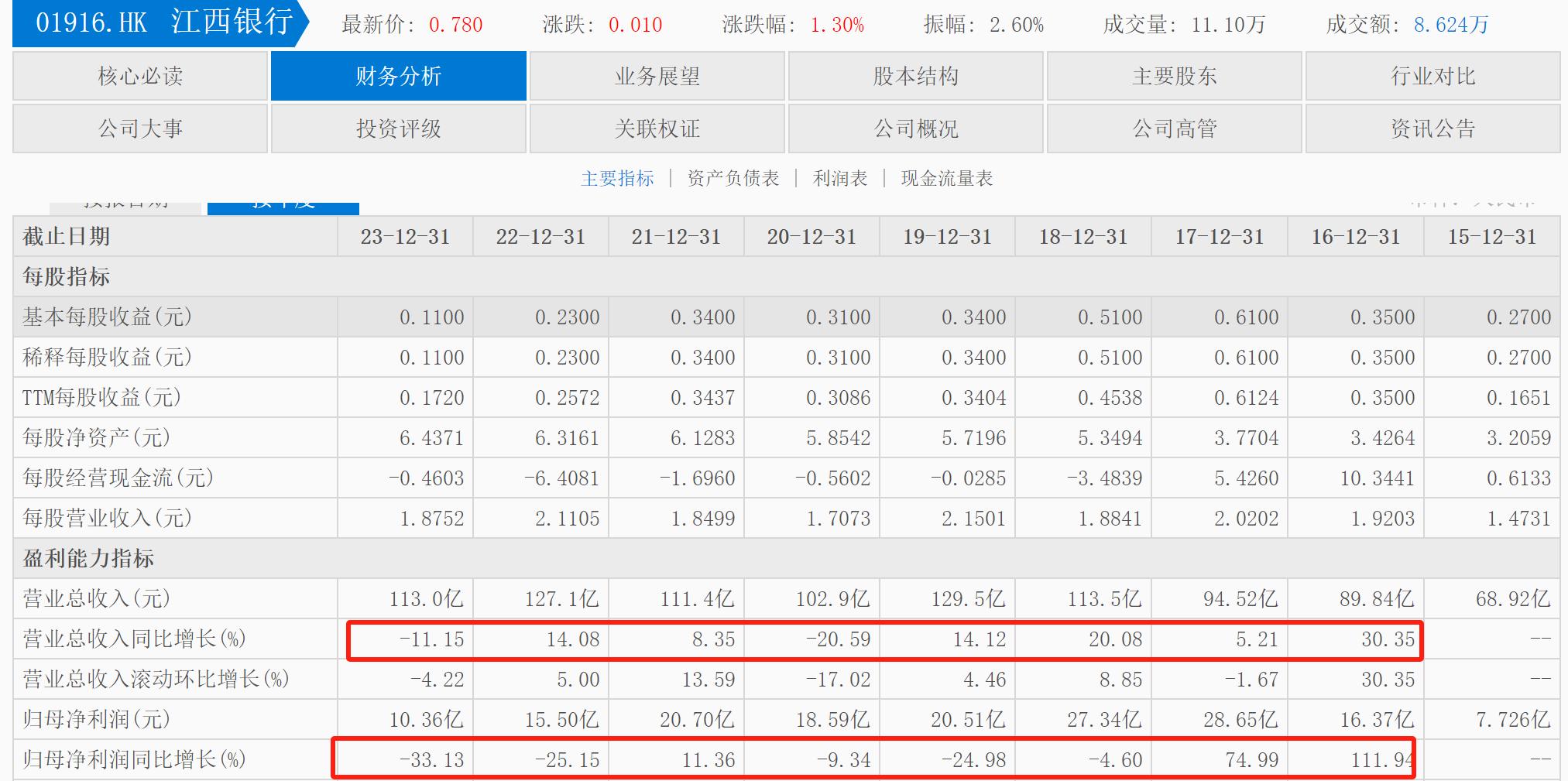 自2023年9月5日起,江西银行的股价就再没超过1港元/股,2024年的2月2日一度跌至0.600港元/股创新低,沦为“仙股”。截至4月15日,江西银行收盘价为0.78港元/股,江西银行2018年的股价曾高达6.951港元/股,距股价高点跌幅已达89%。
