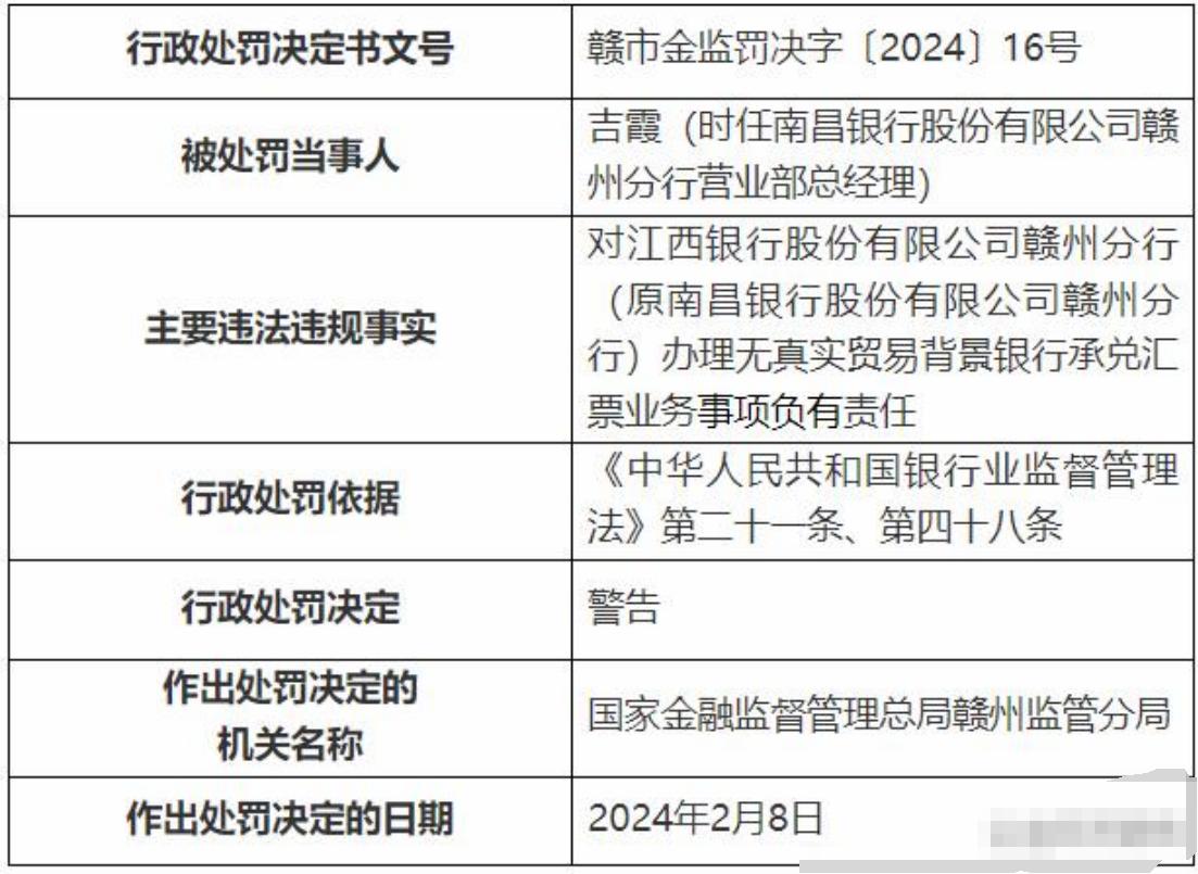 进入2024年,江西银行就接到多张罚单,比如2月8日赣市金监罚决字[2024]16号处罚文书中,江西银行赣州分行(原南昌银行赣州分行)因办理无真实贸易背景银行承兑汇票业务,被罚35万元。其中被处罚当事人有3人,分别为时任南昌银行赣州分行营业部总经理吉霞、赣州分行营业部副总经理谢麟权和赣州分行营业部客户经理胡军兵,3人分别收到警告的行政处罚。