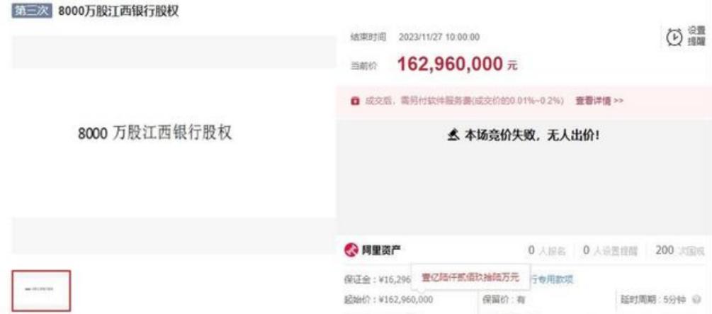 通常来说,一个银行的股权如果经过多次拍卖均遭流拍,说明市场对其并不看好,此前中小银行股权拍卖流拍的很多,不得不进行折价出售,这和中小银行的资产质量有较大关系。2023年11月27日,在阿里资产处置平台,江西银行的8000万股股份被公开竞拍,挂牌方为赣州银行南昌分行,起拍价为1.63亿元,折合每股价格为2.04元。同一天江西银行的港股收盘股价为0.79港元/股,以2.04元/股的价格拍卖,流拍也就不难理解。