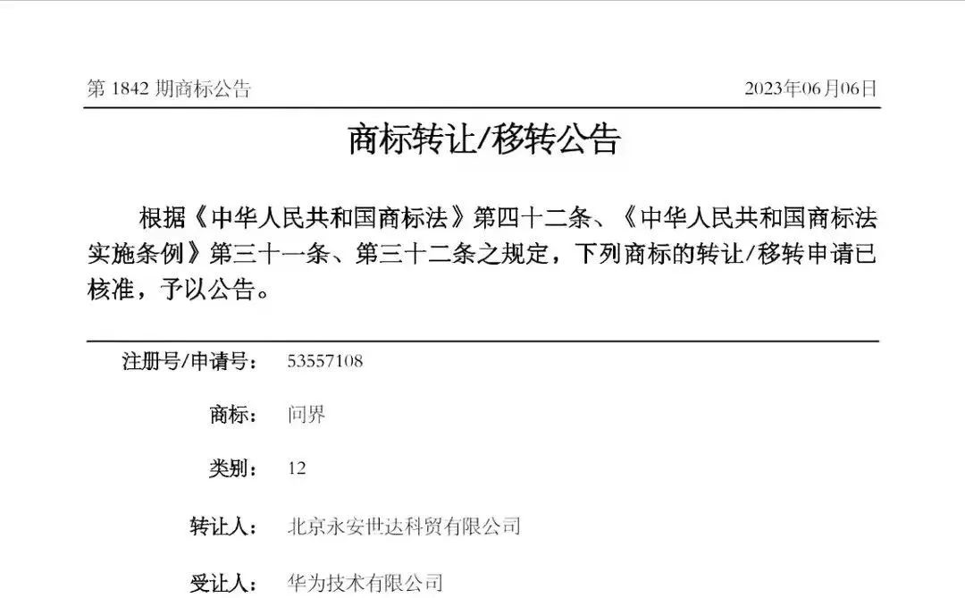 据国家知识产权局消息,6月6日,北京永安世达科贸有限公司将“问界”商标,移转给华为技术有限公司的申请,已经核准。共计21个“问界”商标转让申请已被核准,受让人均为华为技术有限公司,转让申请的收文时间为今年3月7日和8日。问界商标 9 类(电子产品类)和 12 类(车标)已经转让给华为。