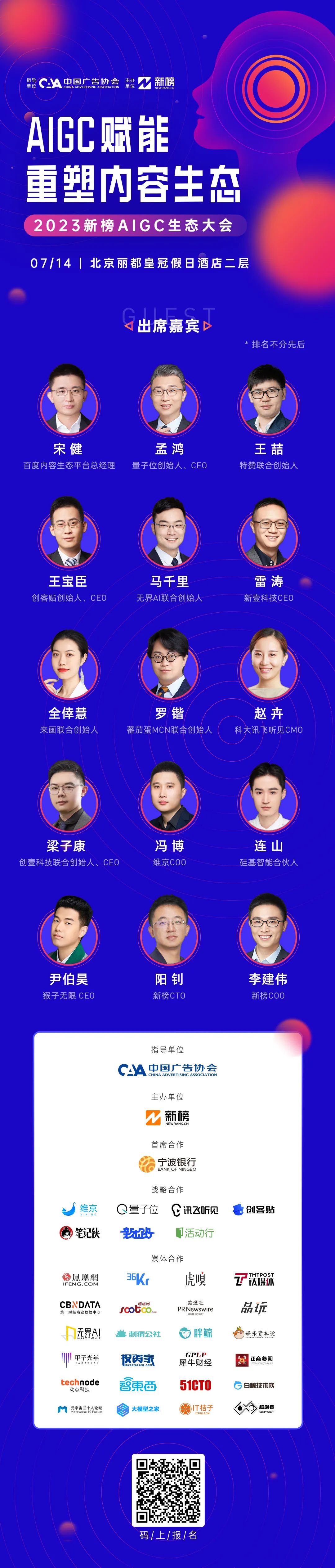 7月14日,由新榜主办的「AIGC赋能 重塑内容生态」2023AIGC生态大会,将在北京丽都皇冠假日酒店举办,诚邀各位玩家来面基!