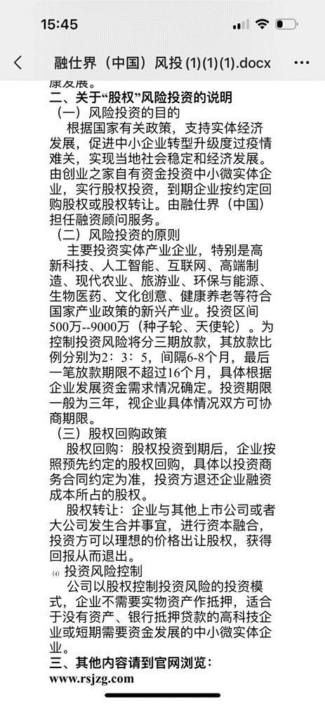 根据葛泽军提供的信息,创业之家负责股权投资,融仕界担任融资顾问。投资区间500万—9000万元。为控制投资风险将分三期付款,放款比例为2:3:5,间隔6个—8个月。投资期限一般为三年。