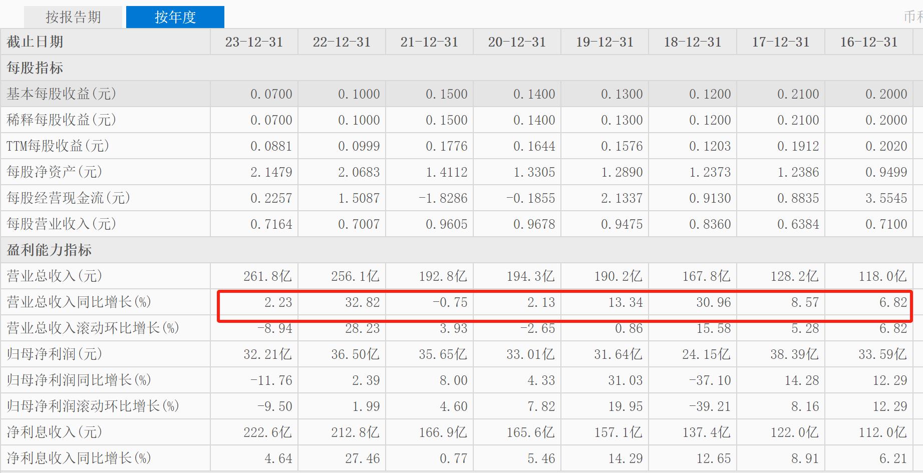 中原银行的营收由2016年的118亿元增至2023年的261.8亿元,营收增长了143.8亿元,总增幅高达122%。但中原银行的净利润却相比2016年还有所下滑。2016年中原银行的净利润为33.59亿元,而2023年的净利润降至32.21亿元,反而减少了1.38亿元,总降幅为4.1%。