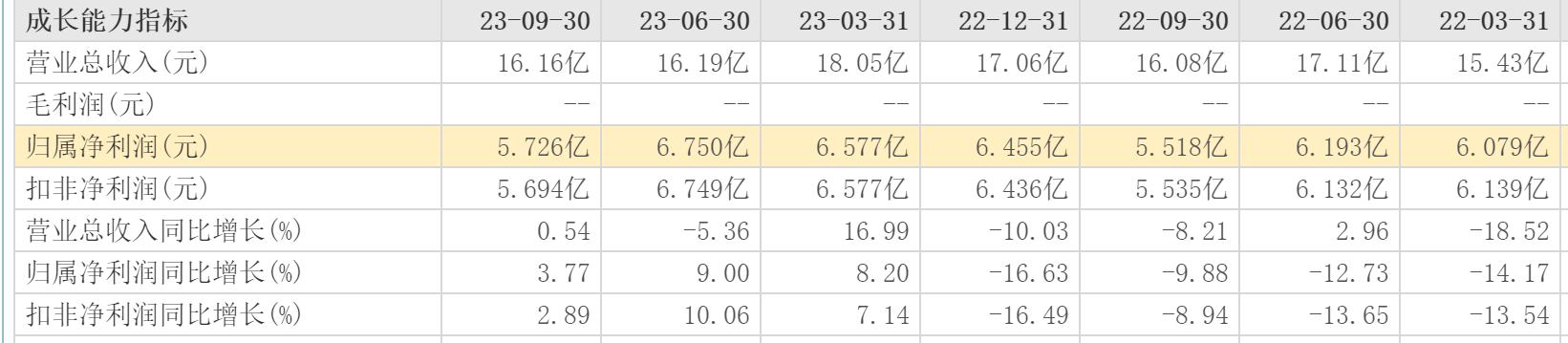 但若仔细分析2023年3个季度的表现,西安银行依然疲态尽显。2023年一季度,西安银行营收18.05亿元,同比增长16.99%;归母净利润6.577亿元,同比增长8.20%。第二季度,西安银行营收16.19亿元,同比下滑5.36%;归母净利润6.750亿元,同比增长9.00%。第三季度,西安银行营收16.16亿元,同比增长只有0.54%;归母净利润5.726亿元,同比增长3.77%。