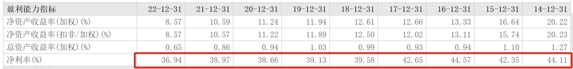 财报显示,2022年西安银行的净利率为36.94%,相比2021年的38.97%下滑了2.03个百分点。通过西安银行近9个完整财年的净利率对比可以发现,2022年的净利率为这9年中最低,和2016年44.57%的净利率高点相比下滑幅度达7.73个百分点。在上市的第一年(2019年),西安银行39.13%的净利率还处于行业中位数以上,随后净利率出现较大波动。