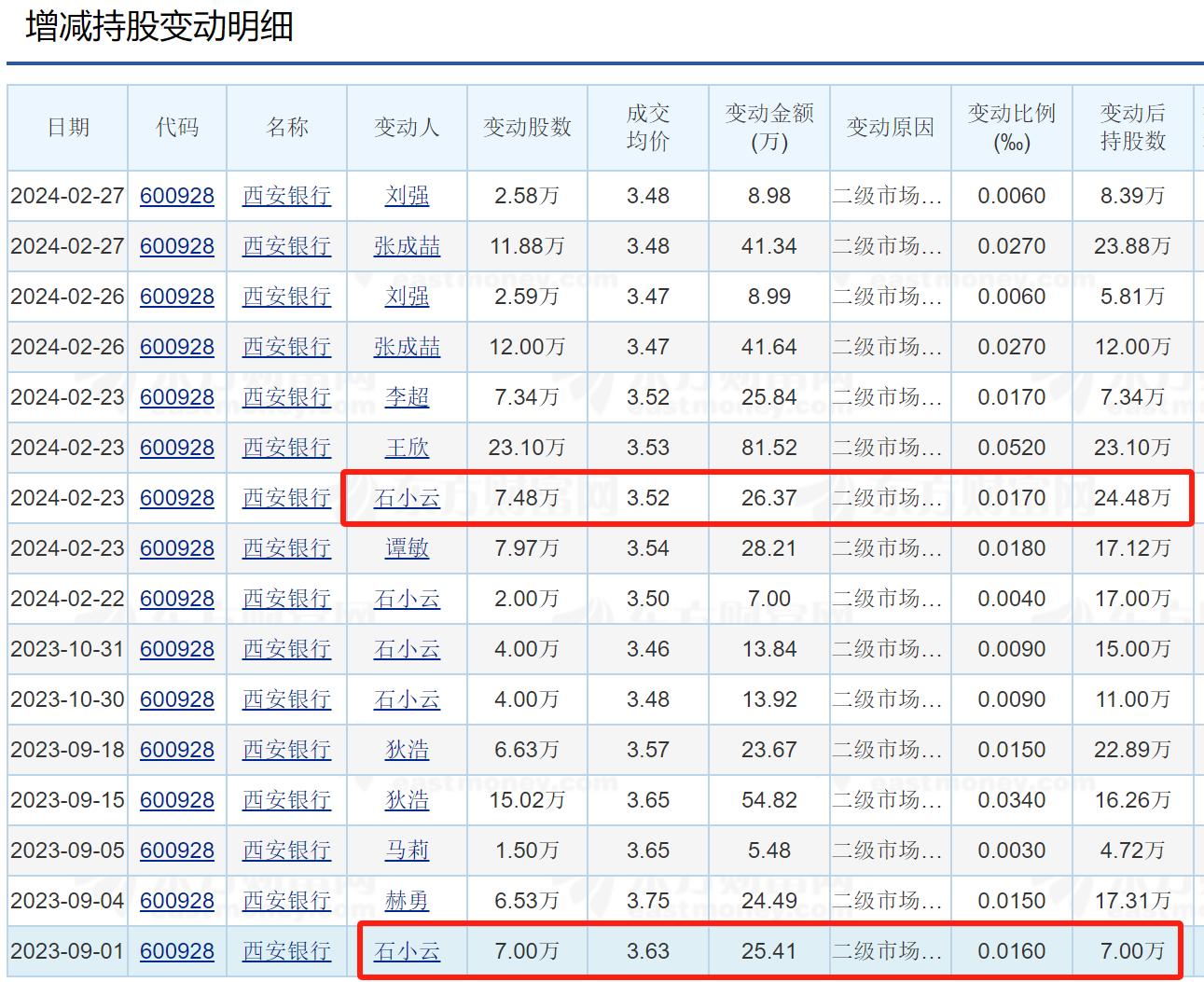 进入2024年,西安银行已经发布两次高管增持公告,2023年也有3次高管增持公告。2024年的高管增持超过200万股,增持金额近700万元。但投资者并不买账,以董秘石小云为例,2023年9月1日首次持股7万股,截至2024年2月23日,经过5次增持,石小云的持股总数为24.48万股。