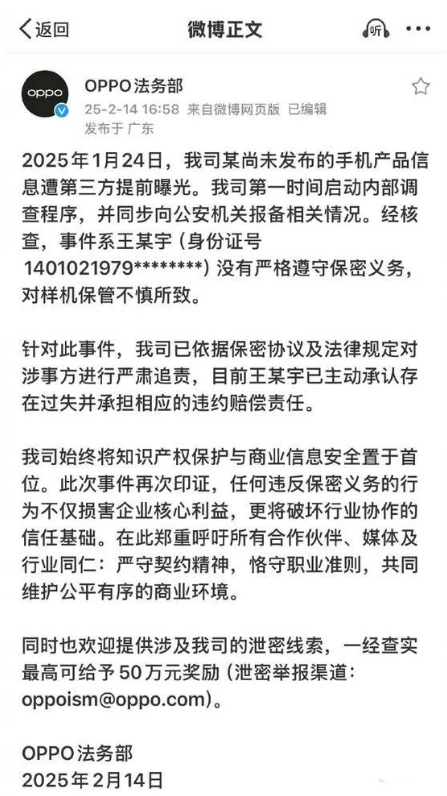 2月14日,OPPO法务部通报调查结果,此次泄密源头为员工王某宇保管样机失职,因其未严格遵守保密义务,导致样机被陈震拍摄并传播。OPPO依据保密协议及法律规定,对涉事的王某宇进行严肃追责,王某宇也主动承认过失,并愿意承担相应违约赔偿责任。