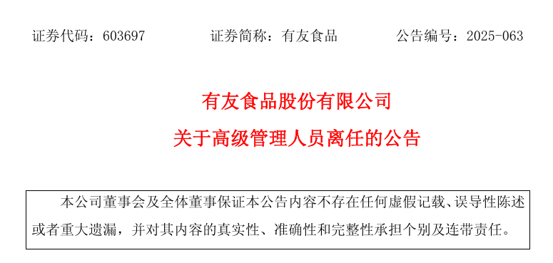9月17日,有友食品发布了高级管理人员离任的公告,副总经理兼董事会秘书肖传志因个人职业发展规划原因,已于2025年9月15日离任,原定任期到期日为2025年11月22日。