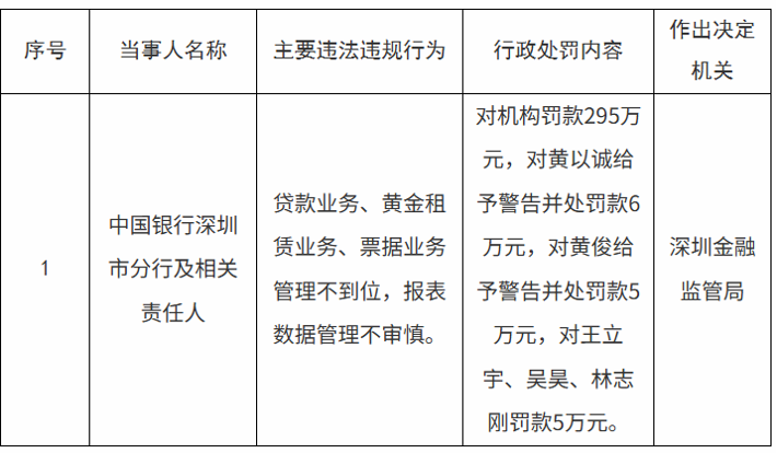 中国银行深圳市分行被罚款295万元 黄金租赁等多项业务管理不到位