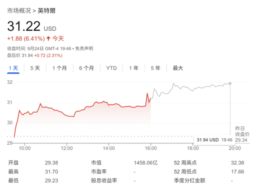 9月24日晚间收盘,英特尔股价大涨6.41%,报31.22美元/股,总市值达1458亿美元。这延续了其自8月中旬以来的反弹势头,累计涨幅已超40%,今年以来涨幅约54%。