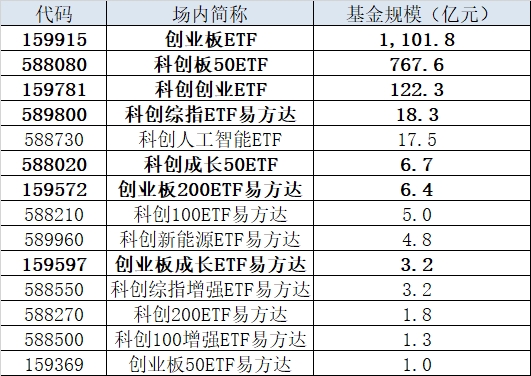 7只千亿级ETF巨头霸榜市场 易方达两创ETF规模超2000亿领跑
