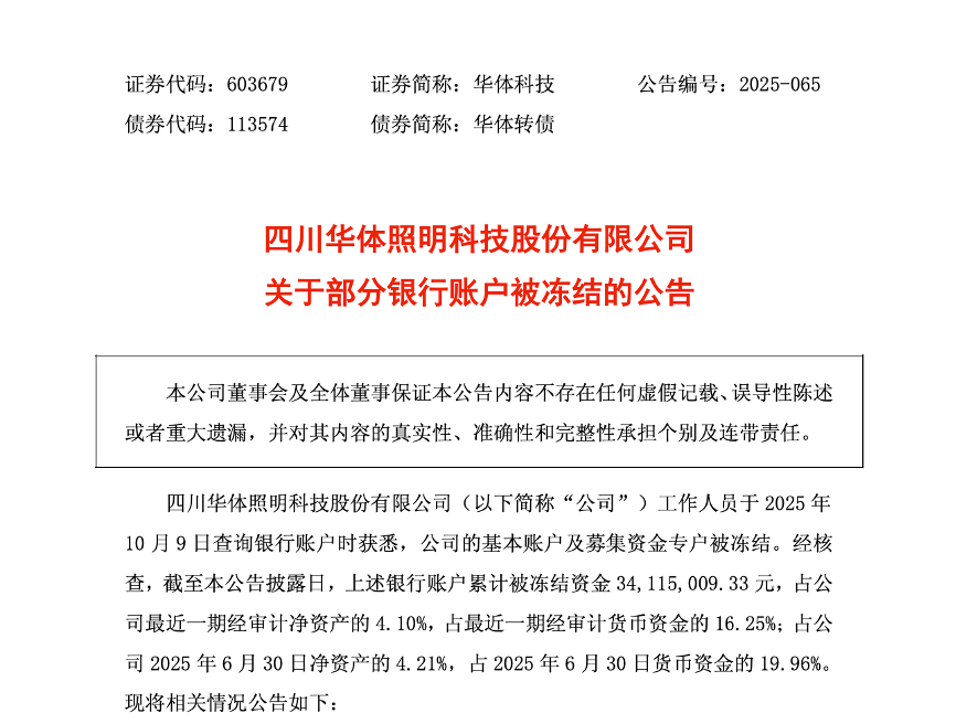 10月9日晚间,华体科技(603679)发布公告披露,公司基本账户及募集资金专户遭司法冻结,合计冻结金额达3411万元。