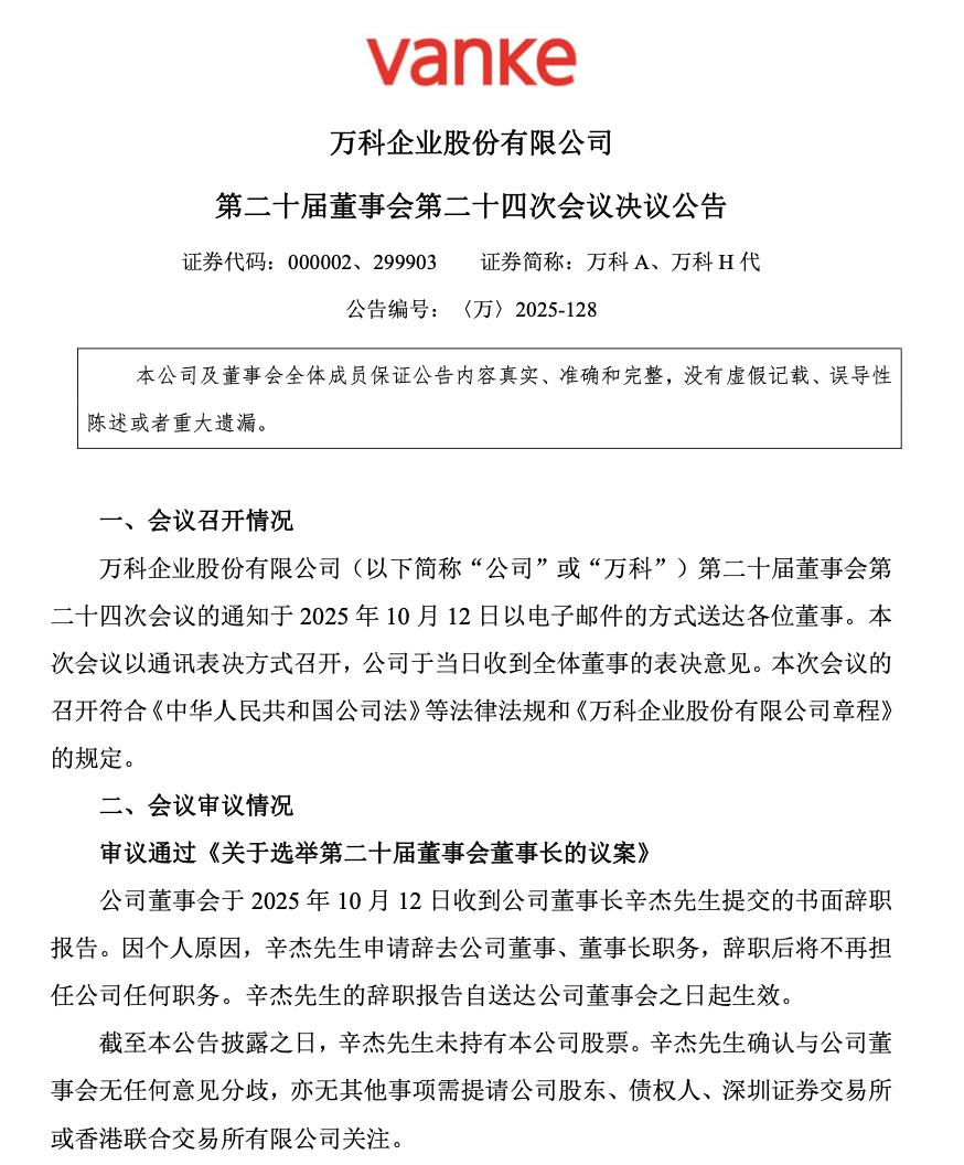 10月13日,万科企业股份有限公司(下称“万科”)发布公告称,董事长辛杰辞去职务,董事会选举黄力平为新任董事长。此次人事变动距离辛杰接任董事长仅过去259天,引发市场广泛关注。