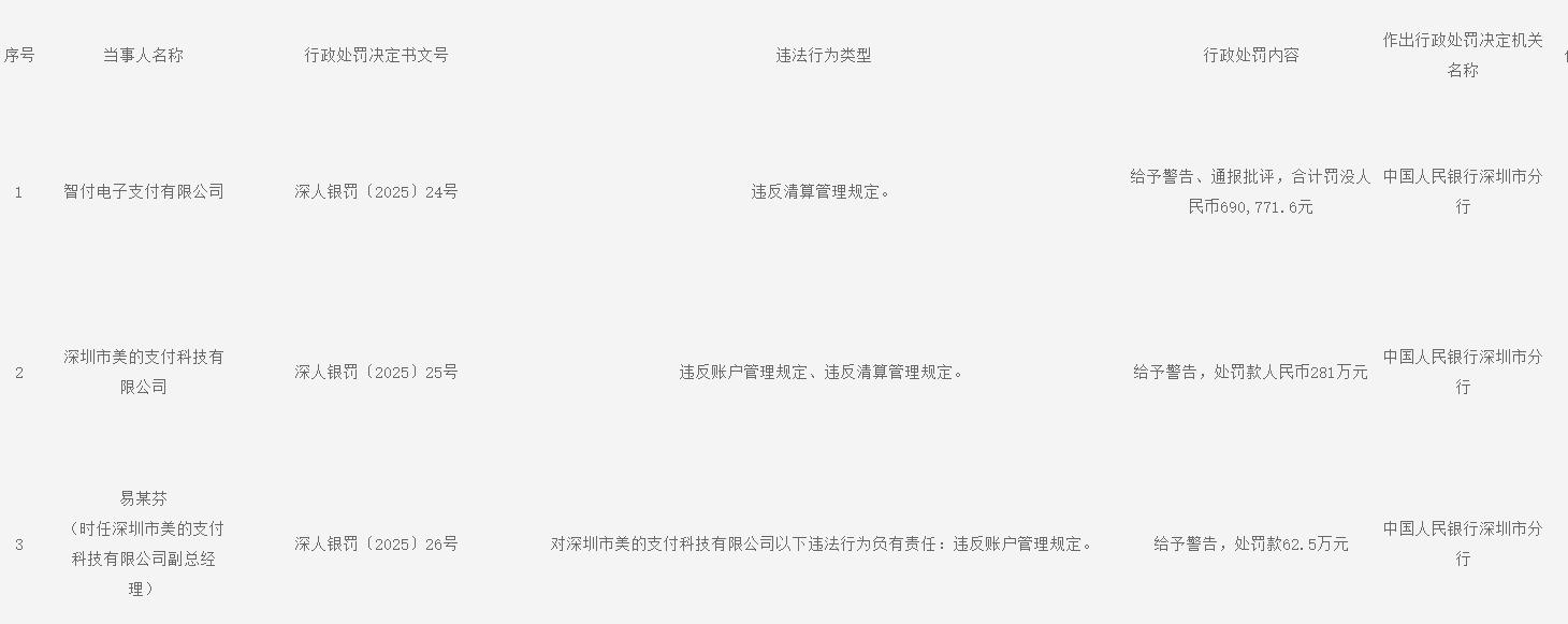 9月30日,中国人民银行深圳市分行公布的行政处罚信息公开表显示,深圳市美的支付科技有限公司(以下简称“美的支付”)因违反账户管理规定、违反清算管理规定,被给予警告,并处罚款281万元。