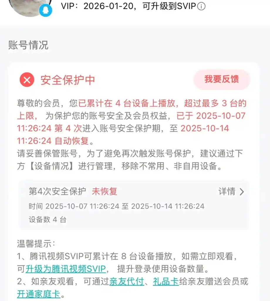 近日,“腾讯视频VIP账号因设备登录超限被封禁7天”的话题引发全网热议。有用户晒出的App页面截图显示,其账号因累计在4台设备播放,超出普通VIP会员3台设备的上限,已于10月7日进入第4次账号保护期,至10月14日方可自动恢复。