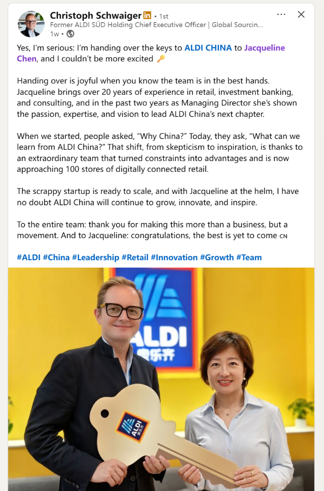 近日,奥乐齐中国前CEO Christoph Schwaiger在领英上宣布,奥乐齐中国将换帅。新CEO将由奥乐齐中国前董事总经理Jacqueline Chen陈佳担任。