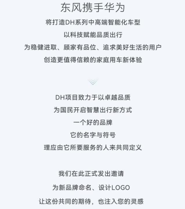 近日,东风奕派发布消息,为东风与华为携手打造的DH项目公开征集中文名和LOGO。