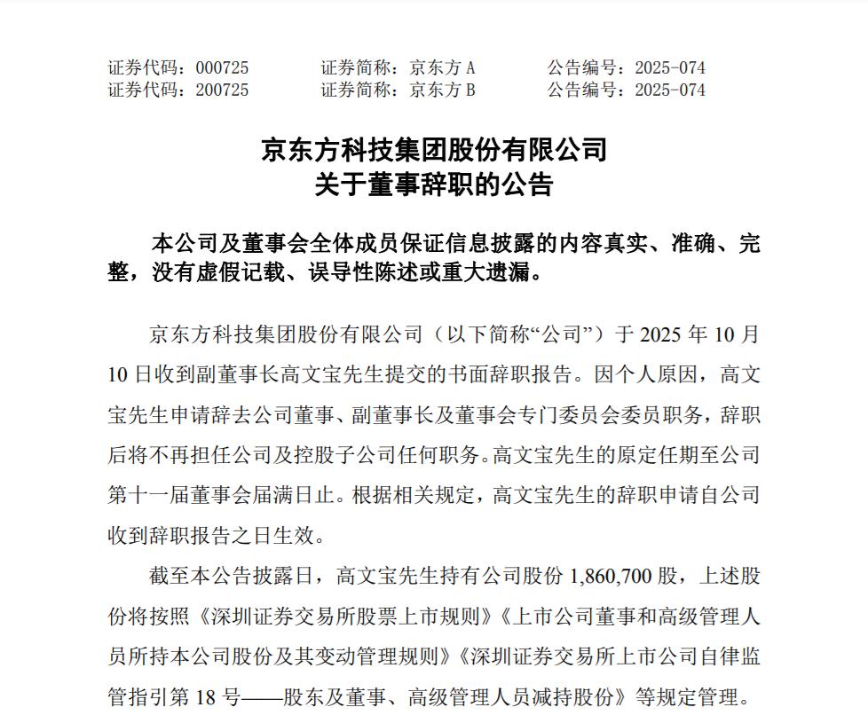 近日,京东方发布公告称,副董事长高文宝因个人原因向董事会提交书面辞职报告,辞去京东方董事、副董事长及董事会专门委员会委员职务。高文宝辞职后将不再担任京东方及旗下任何控股子公司的职务。公告显示,高文宝原定任期至京东方第十一届董事会届满为止,辞职申请自送达之日起正式生效。