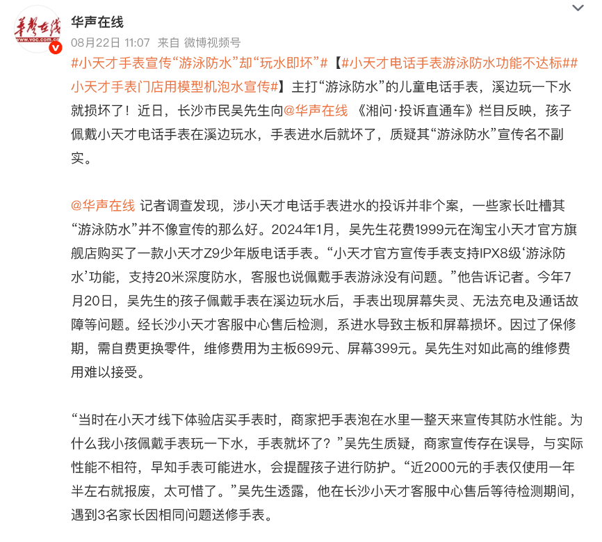 近日,儿童电话手表头部品牌小天才因“游泳级防水”功能失效及售后问题深陷舆论漩涡,暑期集中爆发的消费者投诉引发广泛关注。
