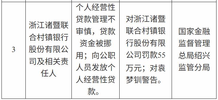 10月9日,国家金融监督管理总局绍兴监管分局公布的行政处罚信息公开表显示,浙江诸暨联合村镇银行股份有限公司因个人经营性贷款管理不审慎,贷款资金被挪用、向公职人员发放个人经营性贷款,被罚款55万元。同时,相关责任人袁梦钏被警告。