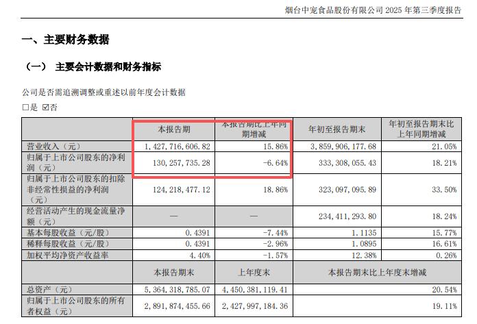 报告显示,中宠股份第三季度营收同比增长15.86%,达到14.28亿元,创下单季新高但增速较前两个季度有所回落;同期归母净利润却同比下滑6.64%,至1.30亿元。