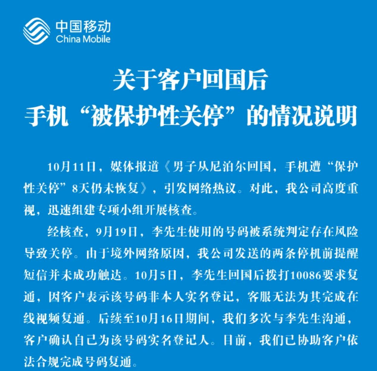 说明指出,10月11日,媒体报道《男子从尼泊尔回国,手机遭“保护性关停”8天仍未恢复》,引发网络热议。对此,中国移动新疆公司高度重视,迅速组建专项小组开展核查。
