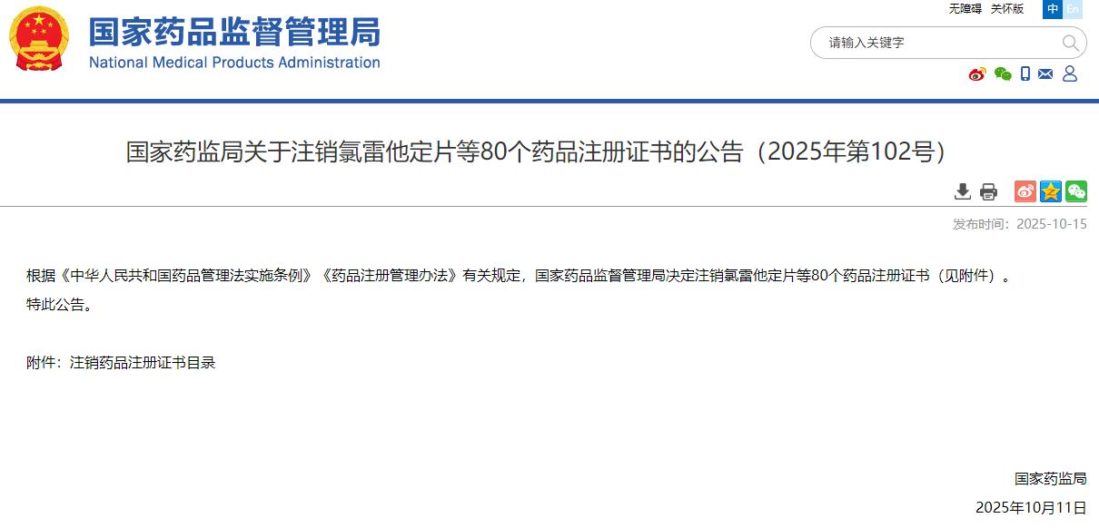 10月15日,国家药品监督管理局发布公告称,注销80个药品的注册证书,其中包括费卡华瑞的氯雷他定片(商品名:可米)、葛兰素史克的吸入用硫酸沙丁胺醇溶液(商品名:万托林)等多款知名进口药品,这些药品后续将停止生产销售。