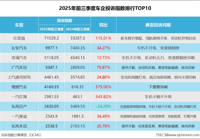2025年前三季度车企投诉指数盘点:理想、红旗投诉激增 比亚迪居首