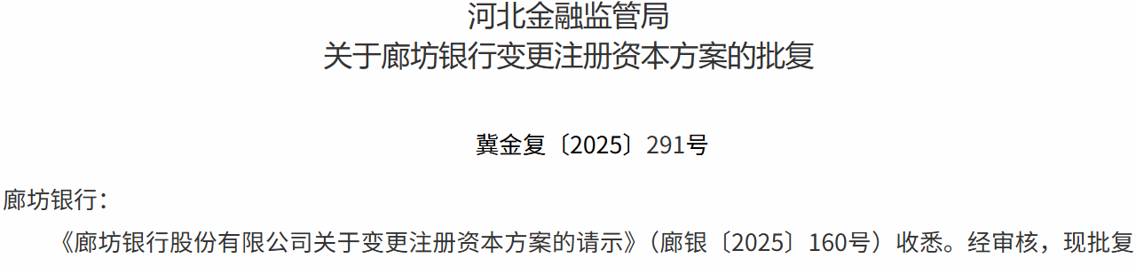 近期,河北金融监管局正式批复廊坊银行增资扩股方案,同意其募集不超过29.09亿股股份。