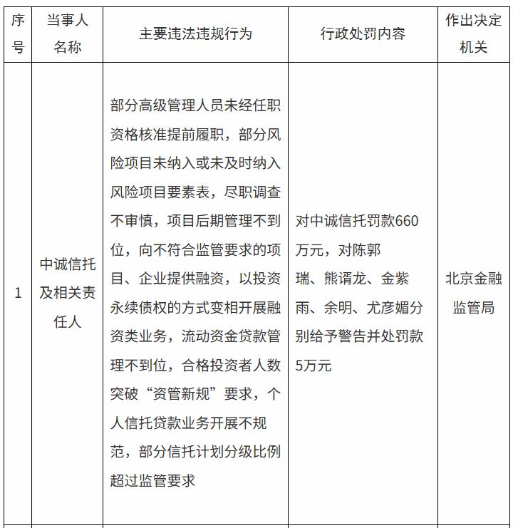 10月17日,国家金融监督管理总局北京监管分局发布的行政处罚信息公开表显示,中诚信托被罚款660万元,该公司相关责任人陈郭瑞、熊谞龙、金紫雨、余明、尤彦媚封分别被给予警告并处罚款5万元。