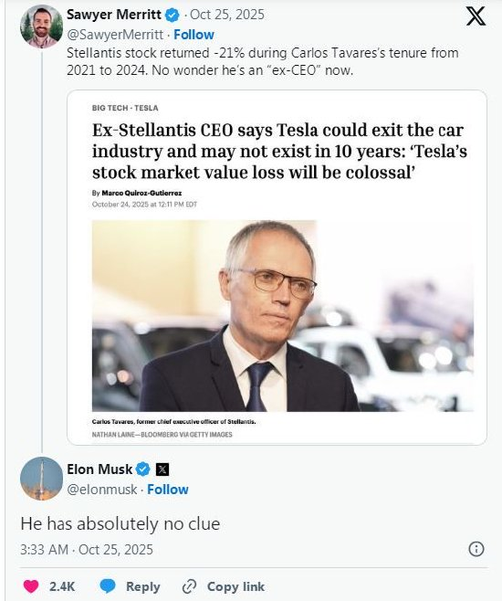 Stellantis前CEO:马斯克对特斯拉投入不足 或被比亚迪超越