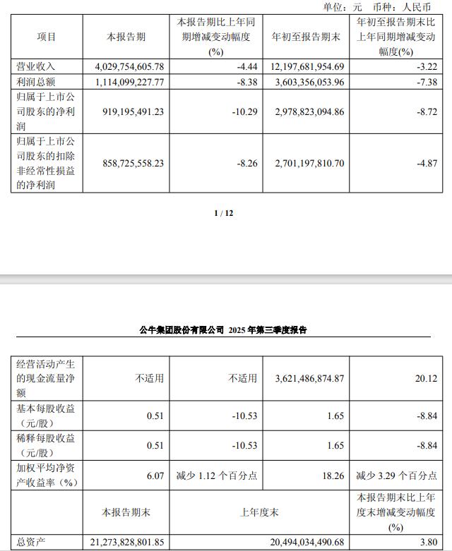 10月30日晚,公牛集团发布2025年第三季度报告。报告显示,2025年前三季度,公牛集团营业收入同比下降3.22%,归母净利润同比下降8.72%。其中第三季度单季归母净利润下降幅度达到10.29%,降幅进一步扩大。