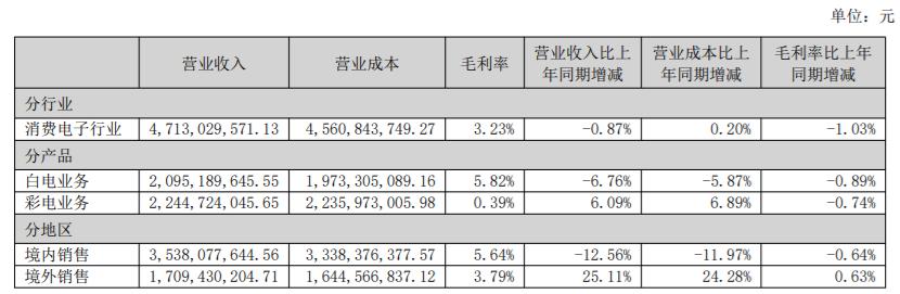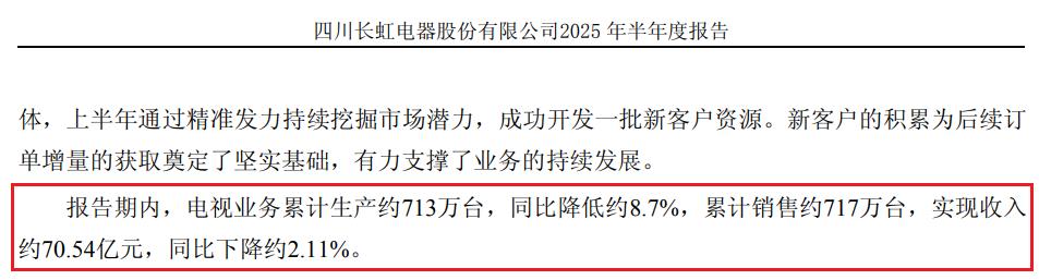 长虹的处境同样不容乐观。从业务构成来看,电视产品在长虹整体营收中的占比正逐渐缩小。根据长虹母公司四川长虹2025年上半年报告显示,四川长虹电视业务收入同比下降约2.11%至70.54亿元,看似下降不多,而且根据之前的数据显示,长虹电视2024年销量1630万台,占国内市场45%以上份额,但其实,其中大部分是为小米、华为等品牌的代工业务。