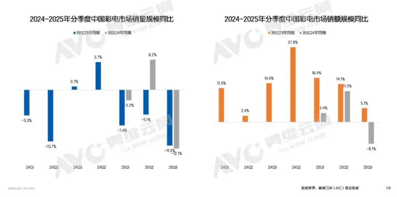 另根据奥维云网最新推总数据显示,今年第三季度电视零售量615万台,同比下滑12.1%;零售额252亿元,同比下降8.1%。