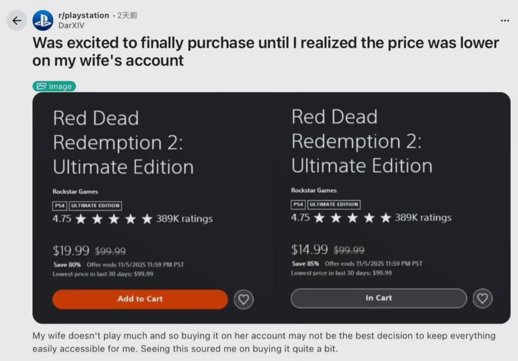 该玩家在Reddit平台表示,他本人的账户中《荒野大镖客:救赎2》标价为19.99美元,而切换到他妻子的账户后,同一游戏的价格却显示为14.99美元。这两个账户位于相同区域,使用同一台主机登录,结算货币也完全一致。