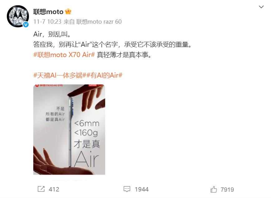 近日,联想moto通过官方微博发文称:Air,别乱叫。答应我,别再让“Air”这个名字,承受它不该承受的重量。疑似暗示市场上部分以“Air”命名的手机并未达到真正的轻薄标准。
