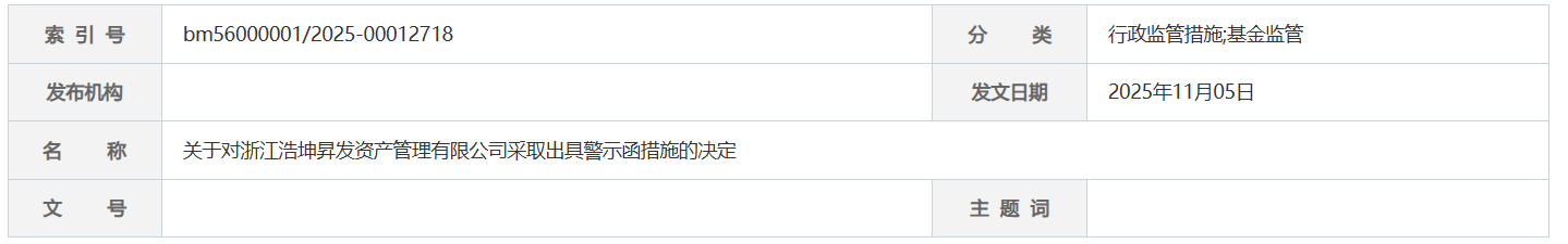 11月5日,浙江证监局披露,对浙江浩坤昇发资产管理有限公司(以下简称“浩坤昇发”)采取出具警示函措施。