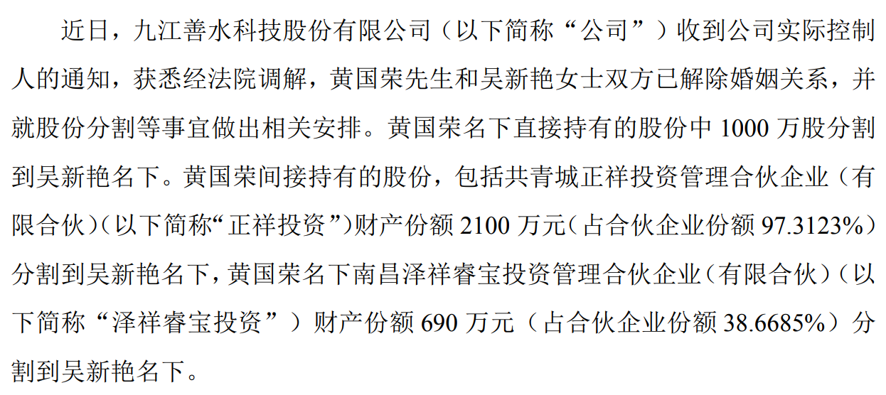 近日,九江善水科技股份有限公司(以下简称“善水科技”)发布公告称,收到实际控制人的通知,获悉经法院调解,黄国荣和吴新艳双方已解除婚姻关系,并就股份分割等事宜做出相关安排。