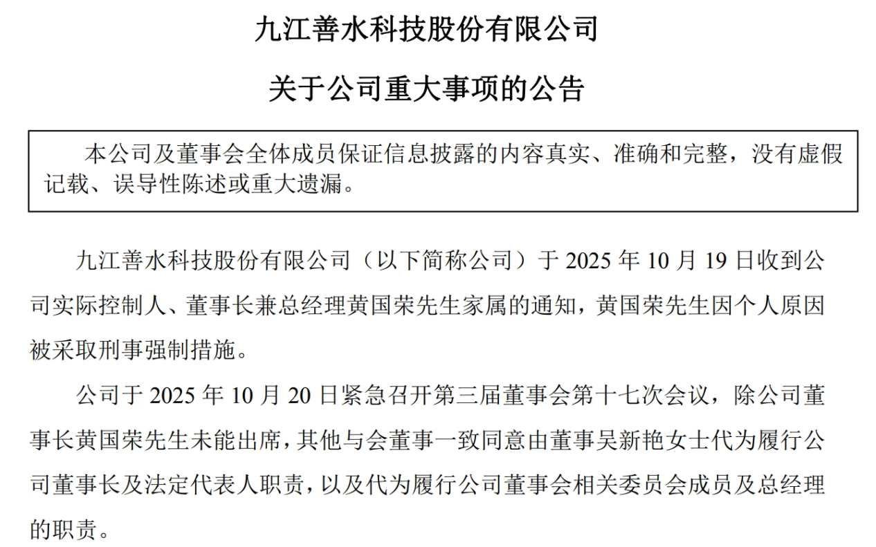 此外,善水科技10月20日发布公告称,于2025年10月19日收到实际控制人、董事长兼总经理黄国荣家属的通知,黄国荣因个人原因被采取刑事强制措施。