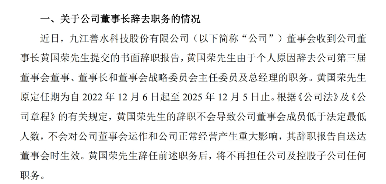 11月7日,善水科技宣布,收到公司董事长黄国荣先生提交的书面辞职报告,黄国荣先生由于个人原因辞去公司第三届董事会董事、董事长和董事会战略委员会主任委员及总经理的职务。