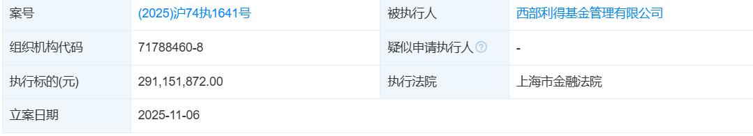 近期,天眼查信息显示,西部利得基金名下增加一条“被执行人”信息,执行法院为上海金融法院,执行标的为2.91亿元,立案日期为11月6日。