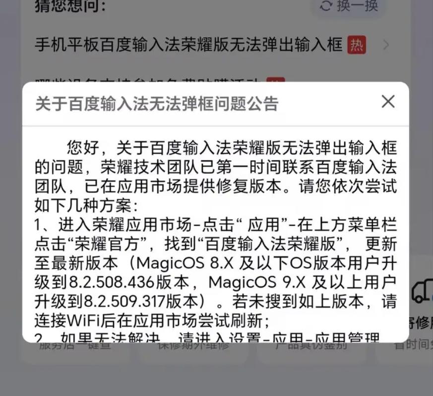 近日,据极目新闻报道,不少荣耀手机用户在各社交平台反映,其设备自带的百度输入法荣耀版出现无法弹出输入框的故障,导致在使用微信、QQ等社交软件时无法正常打字。一位手机维修店工作人员发布视频称,仅在事发一小时内就接到了三台出现同样问题的荣耀手机。