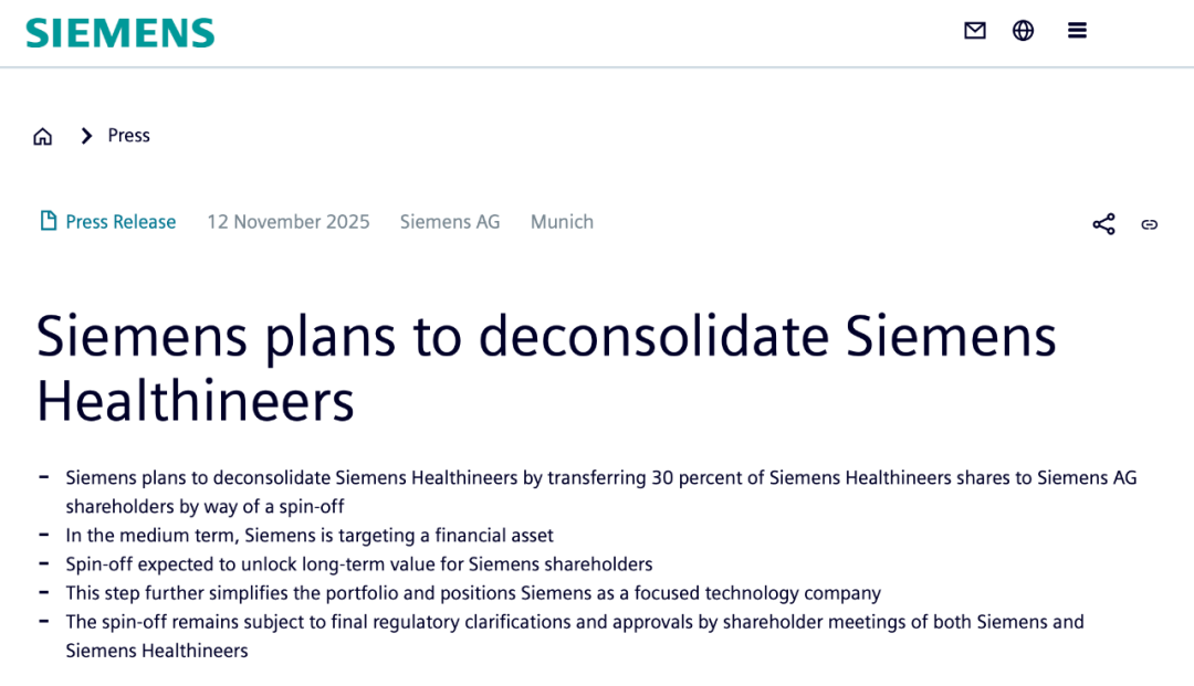近日,德国工业巨头西门子集团正式宣布重大股权调整计划,将以“直接分拆”方式向自身股东划转所持西门子医疗约30%的股份,涉及股权价值达335亿欧元。
