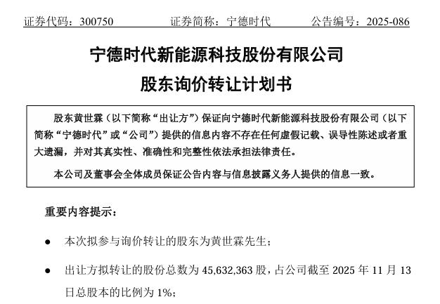 11月14日晚间,宁德时代(300750.SZ)发布公告称,联合创始人黄世霖拟通过询价转让方式减持4563.24万股,占总股本的1%,转让原因为自身资金需求。以宁德时代14日收盘价404.12元/股测算,黄世霖拟减持股份市值约184.41亿元。