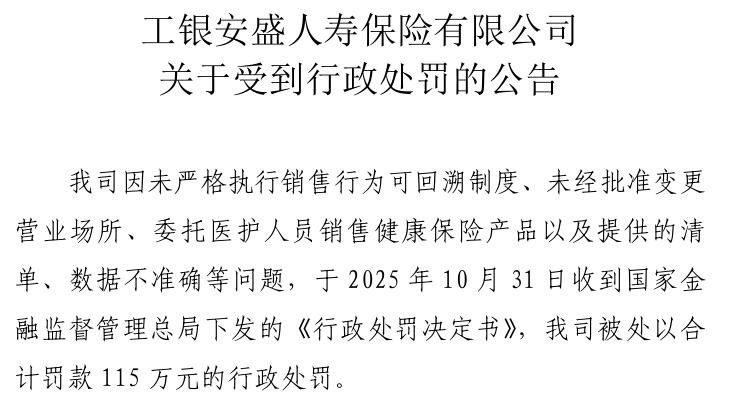 日前,工银安盛人寿发布公告称,因未严格执行销售行为可回溯制度、未经批准变更营业场所、委托医护人员销售健康保险产品以及提供的清单、数据不准确等问题,于2025年10月31日收到国家金融监督管理总局下发的《行政处罚决定书》,被处以合计罚款115万元的行政处罚。