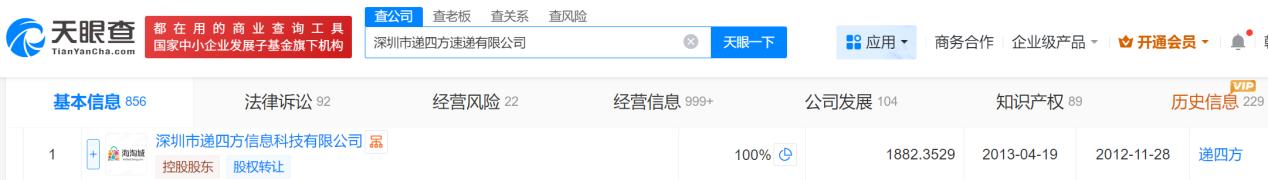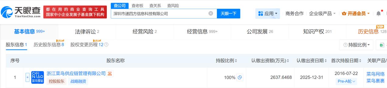 天眼查信息显示,阿里巴巴旗下菜鸟实现全面掌控跨境物流商“递四方”。值得关注的是,1年以来,菜鸟连续增资深圳市递四方信息科技有限公司,11月18日实现100%控股。