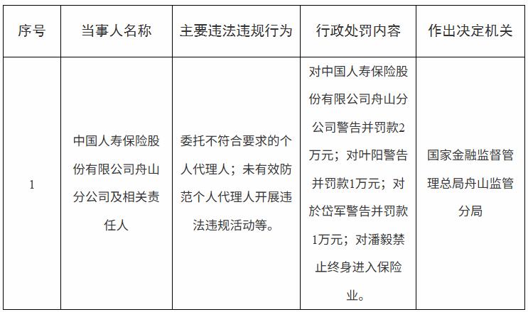 中国人寿舟山分公司被罚款2万元 相关责任人被终身禁业