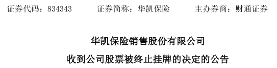 11月21日,华凯保险发布公告称,2025年11月21日收到全国中小企业股份转让系统有限责任公司《关于终止华凯保险销售股份有限公司股票挂牌的决定》。