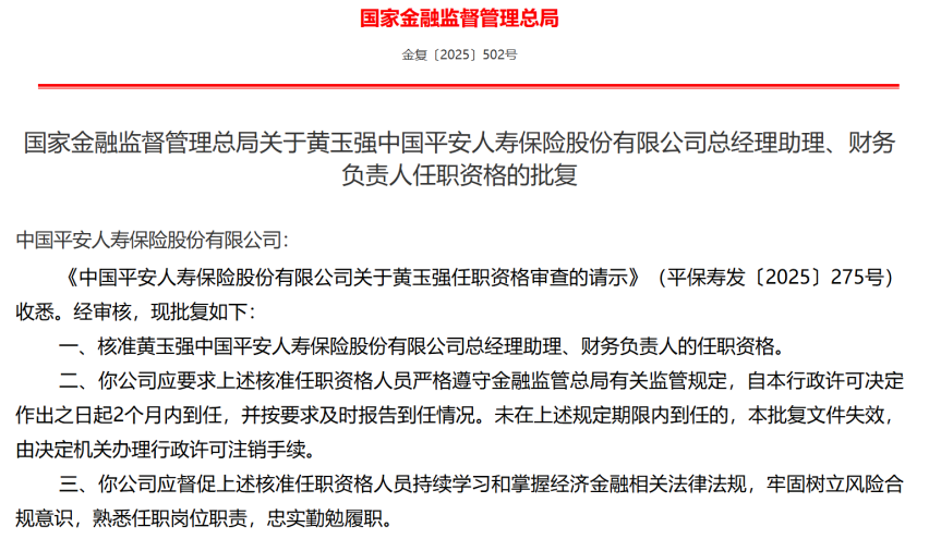 近日,国家金融监督管理总局发布批复,核准黄玉强中国平安人寿保险股份有限公司(以下简称 “平安人寿”)总经理助理、财务负责人任职资格,要求其自行政许可决定作出之日起 2 个月内到任,未按期到任则批复失效。