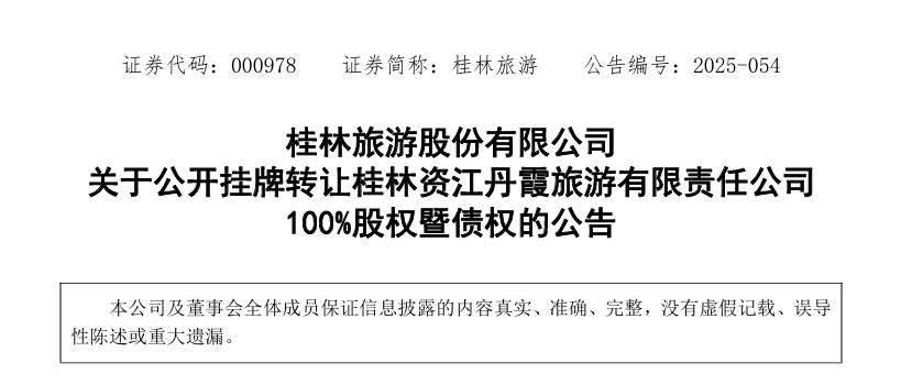 11月25日晚间,桂林旅游发布公告称,为优化资产结构,提高资产运营效率,减少亏损,拟公开挂牌转让资江丹霞公司100%股权暨债权。